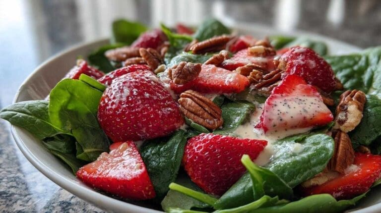 It s got that perfect mix of sweet strawberries, tender spinach, and a delightful crunch from those candied pecans. Then, that tangy poppy seed dressing just ties it all together beautifully.