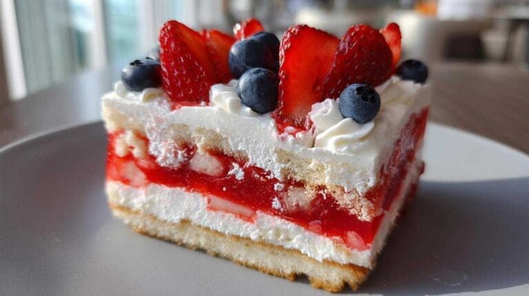 This cake is exactly that kind of magic. It s surprisingly easy to pull together, but the finished result? Pure showstopper. That vibrant red from the strawberry jello soaking into the cake, topped with fluffy white whipped cream and bright berries arranged like a flag it just makes everyone smile.